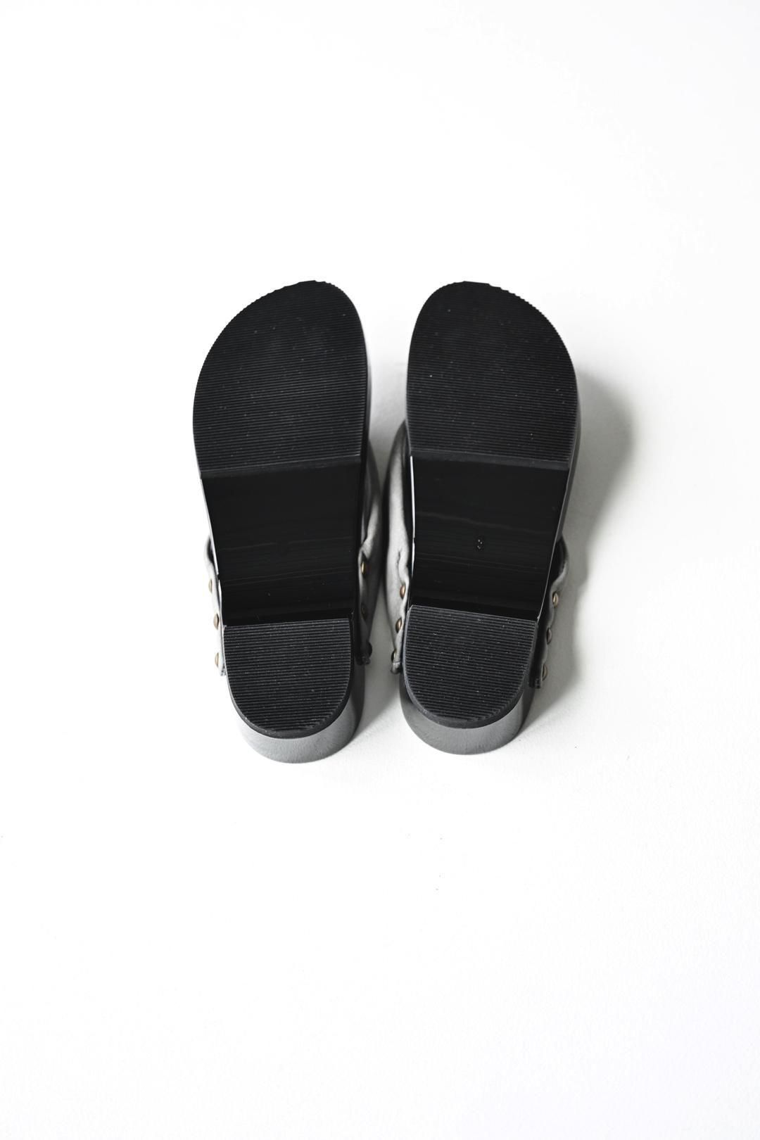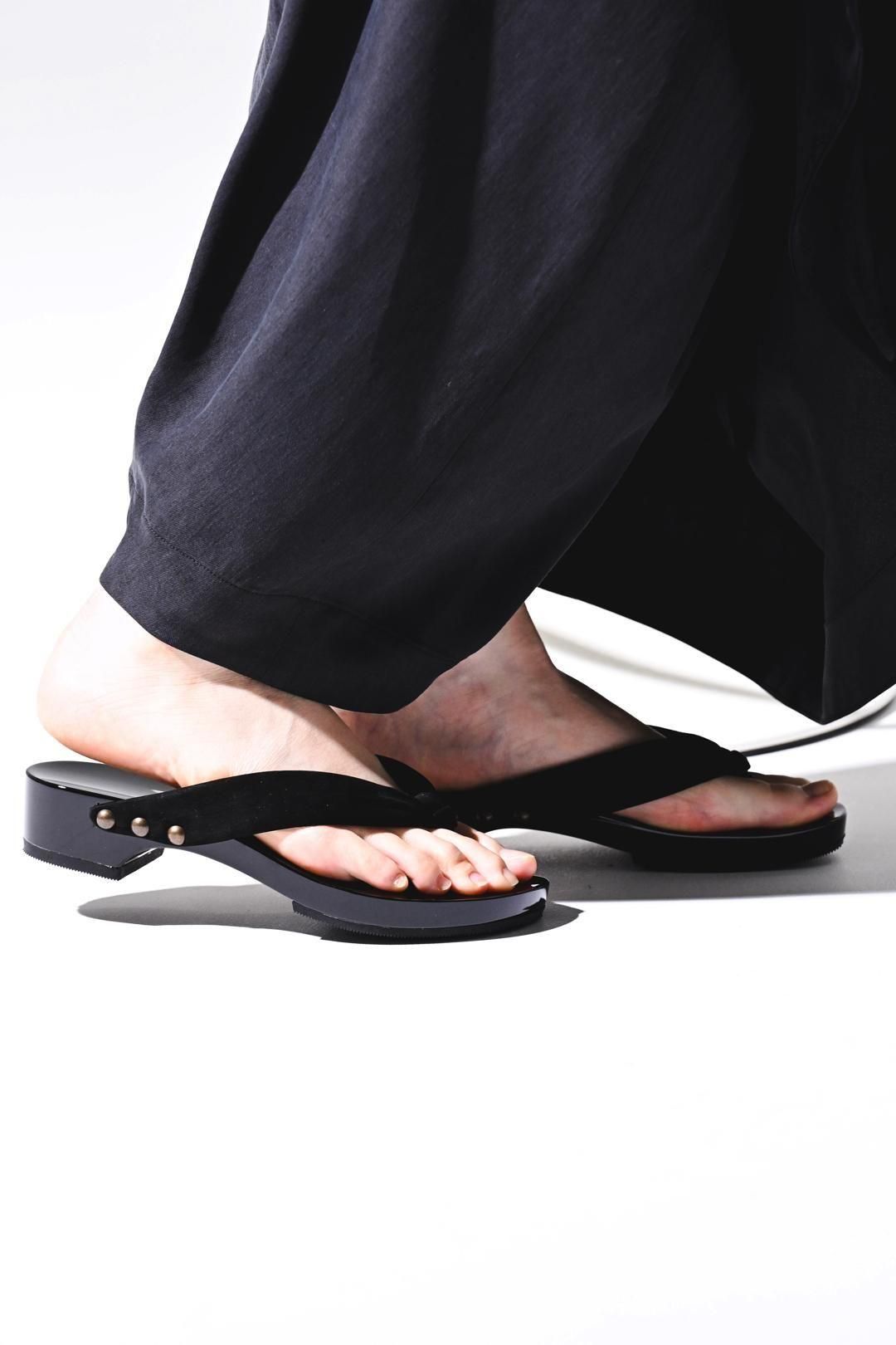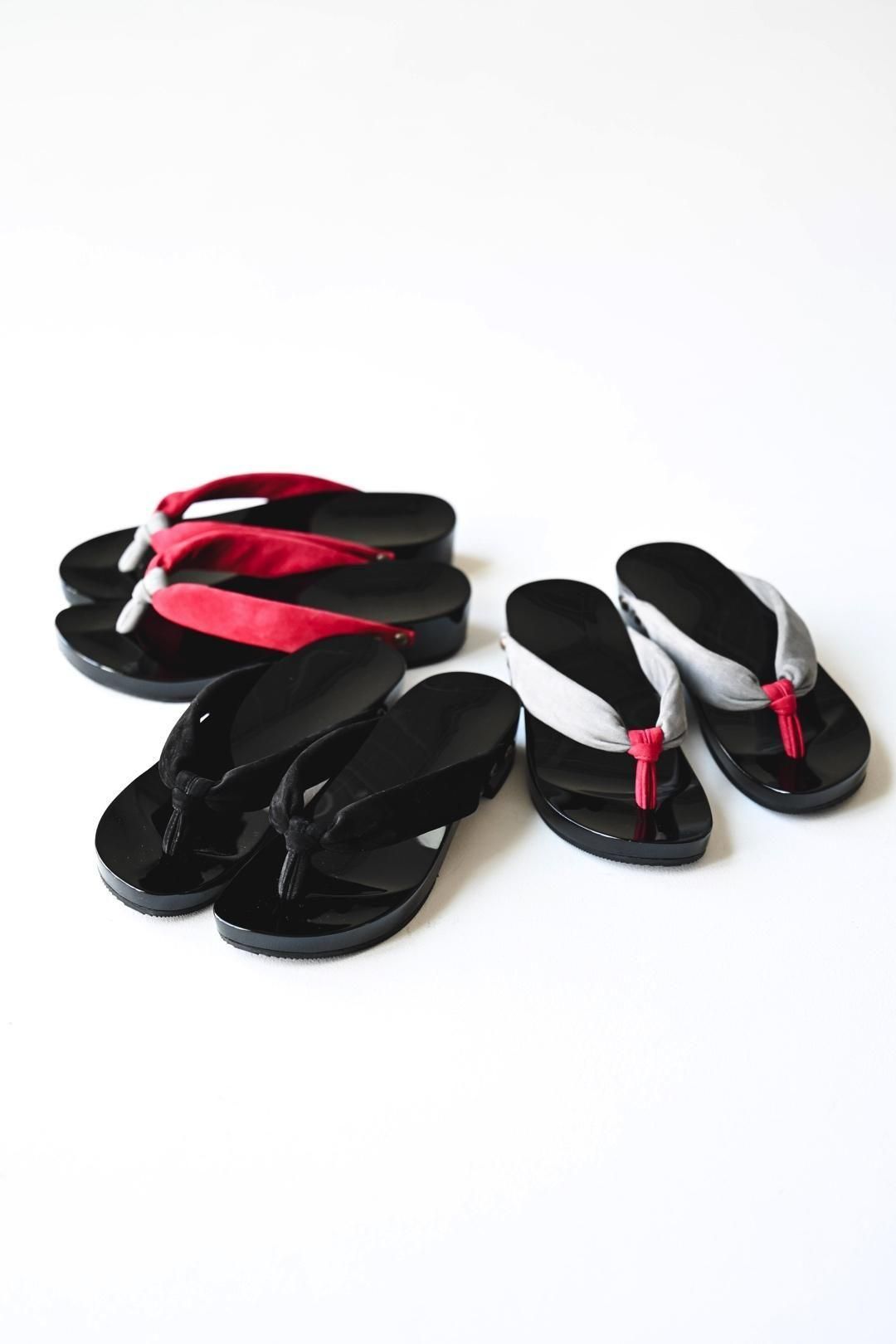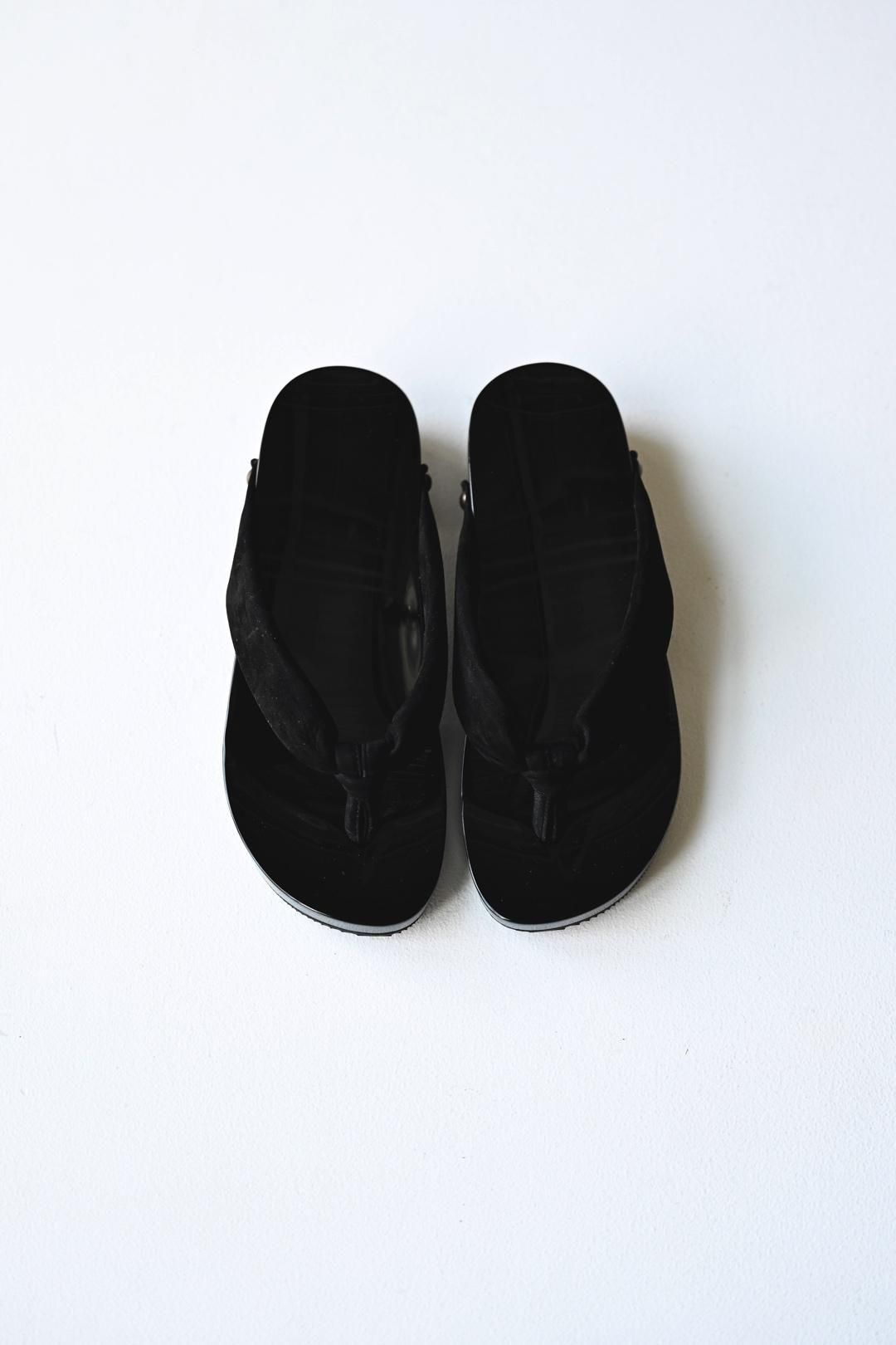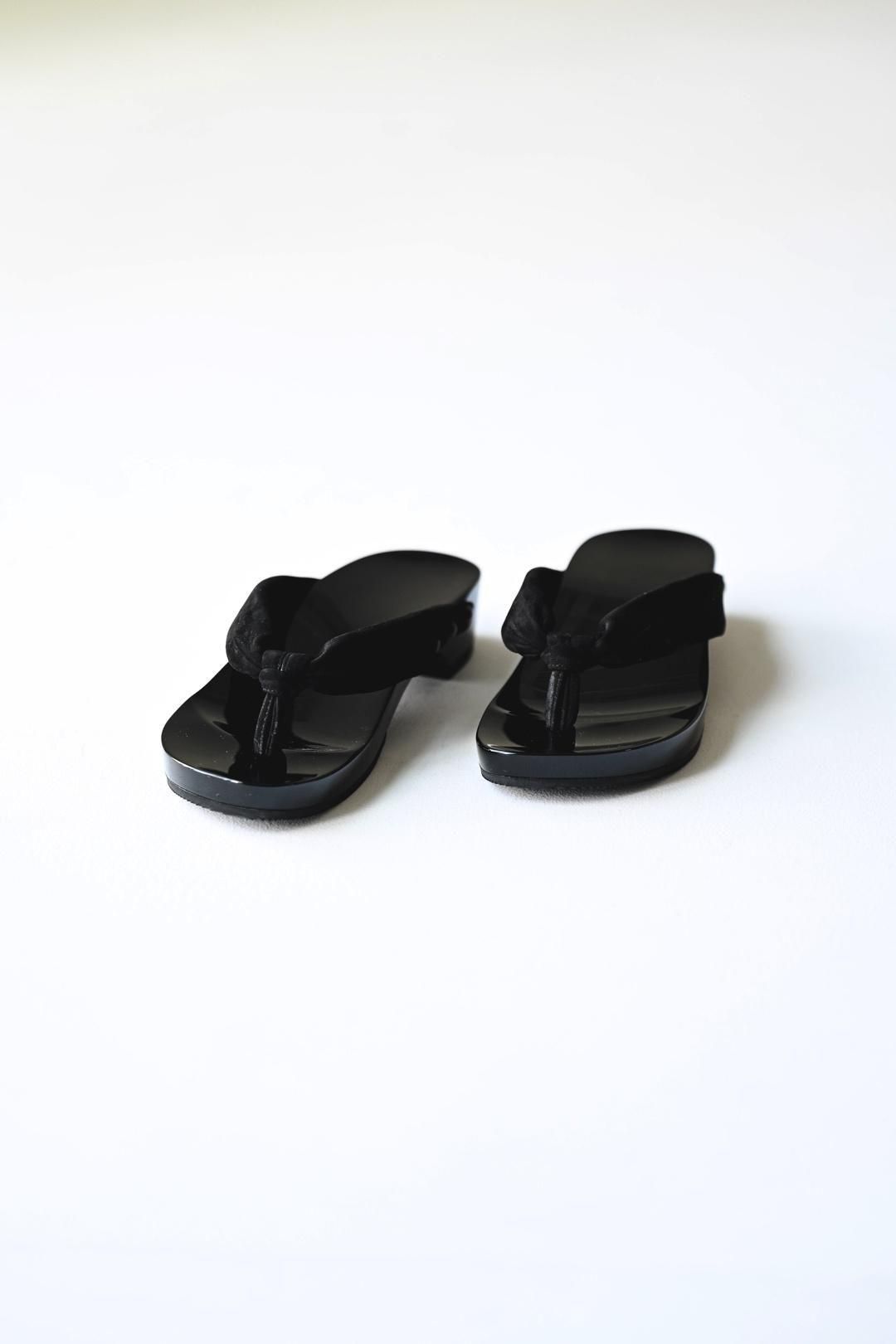 品ある黒塗りが施された木地に、上質なヌバックレザーの鼻緒を用いた美しい履き物です。