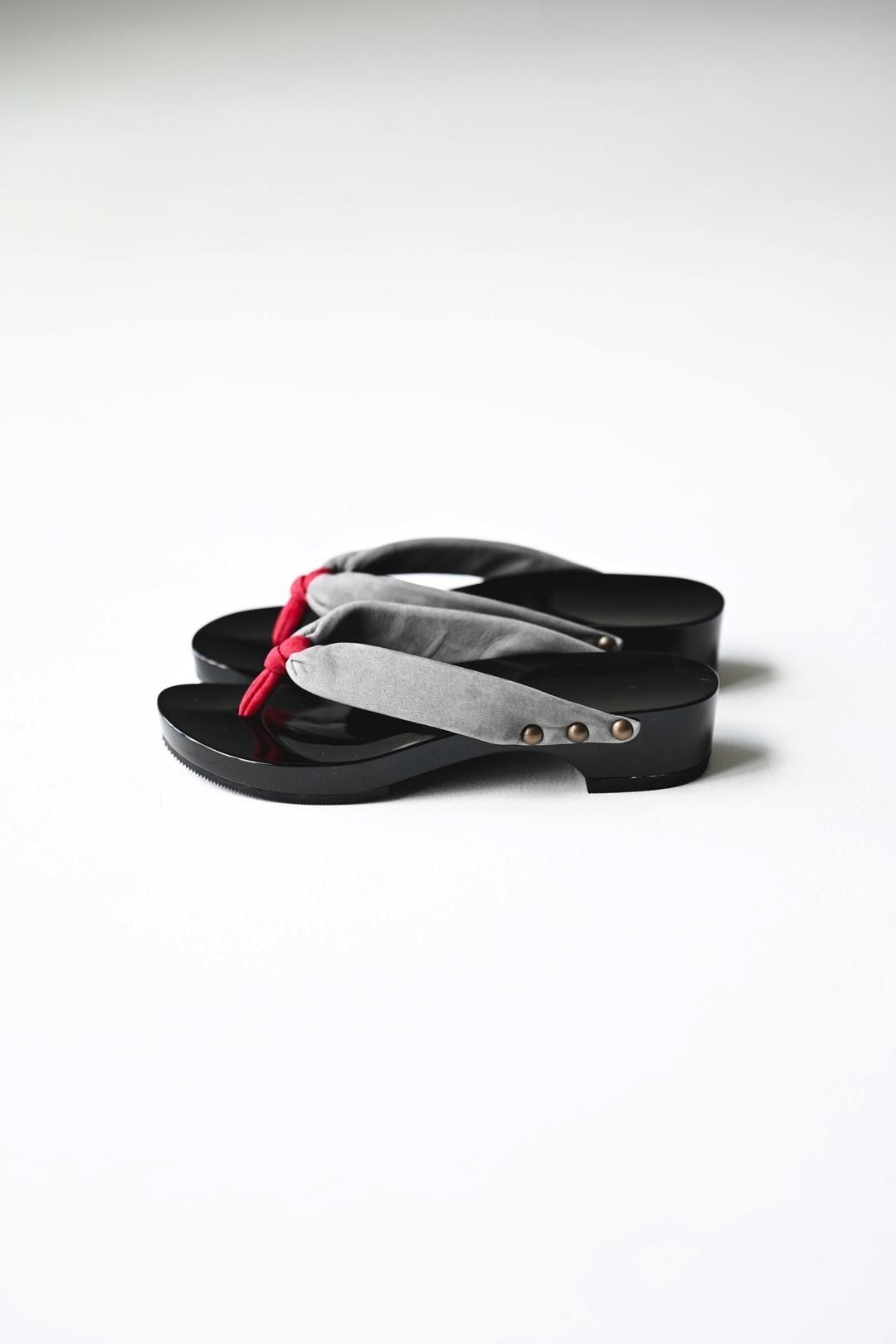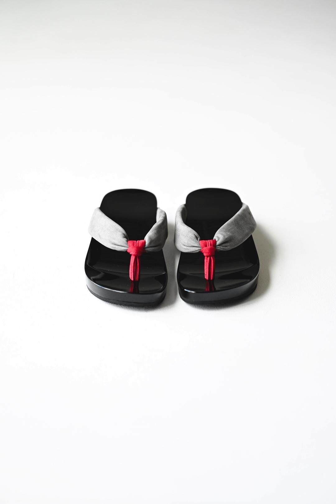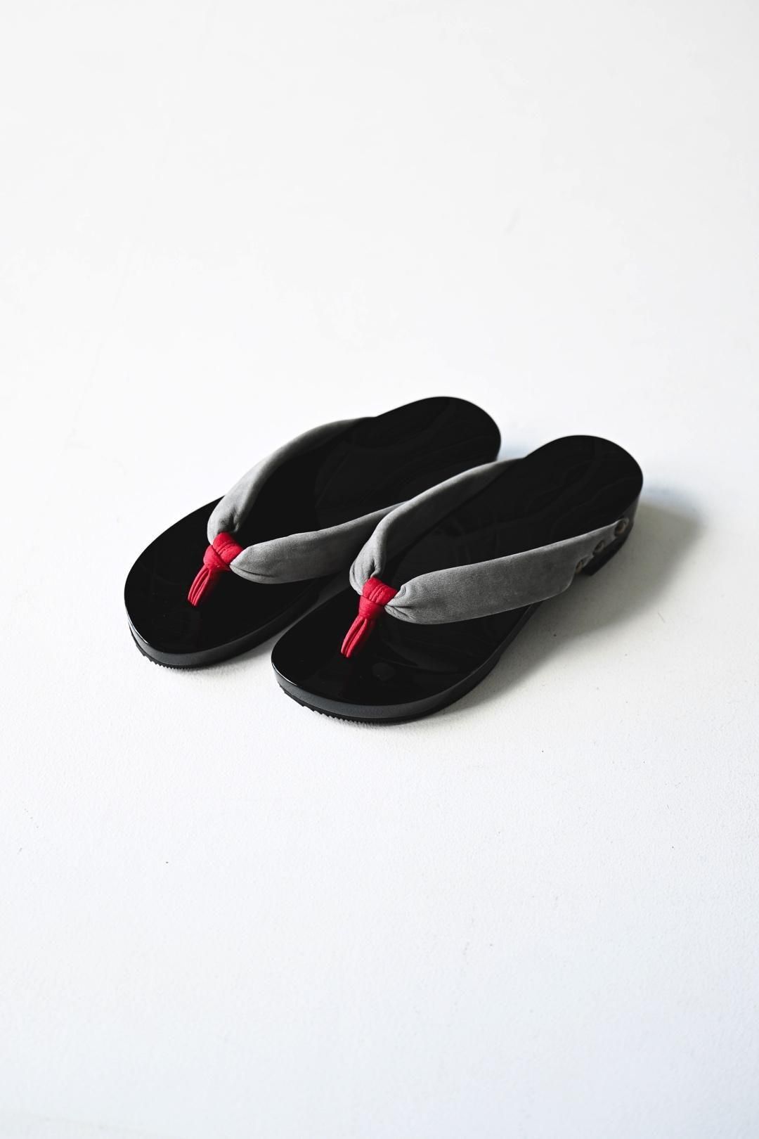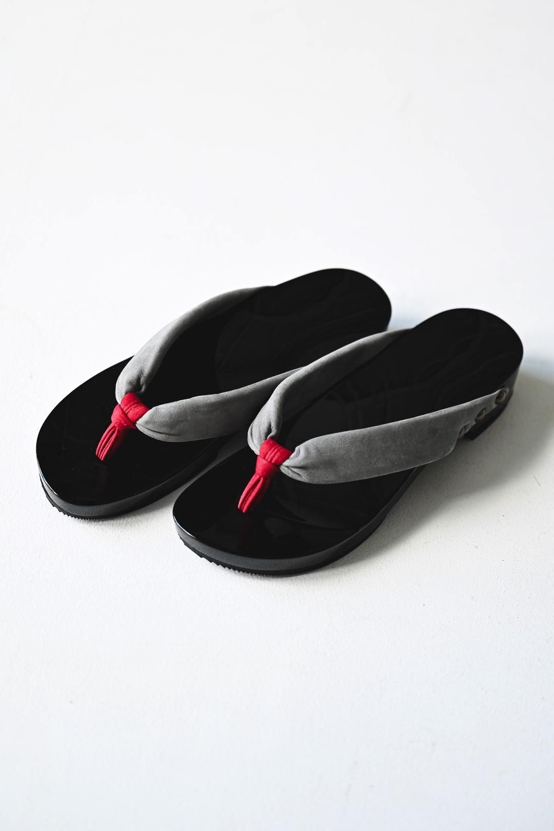 品ある黒塗りが施された木地に、上質なヌバックレザーの鼻緒を用いた美しい履き物です。