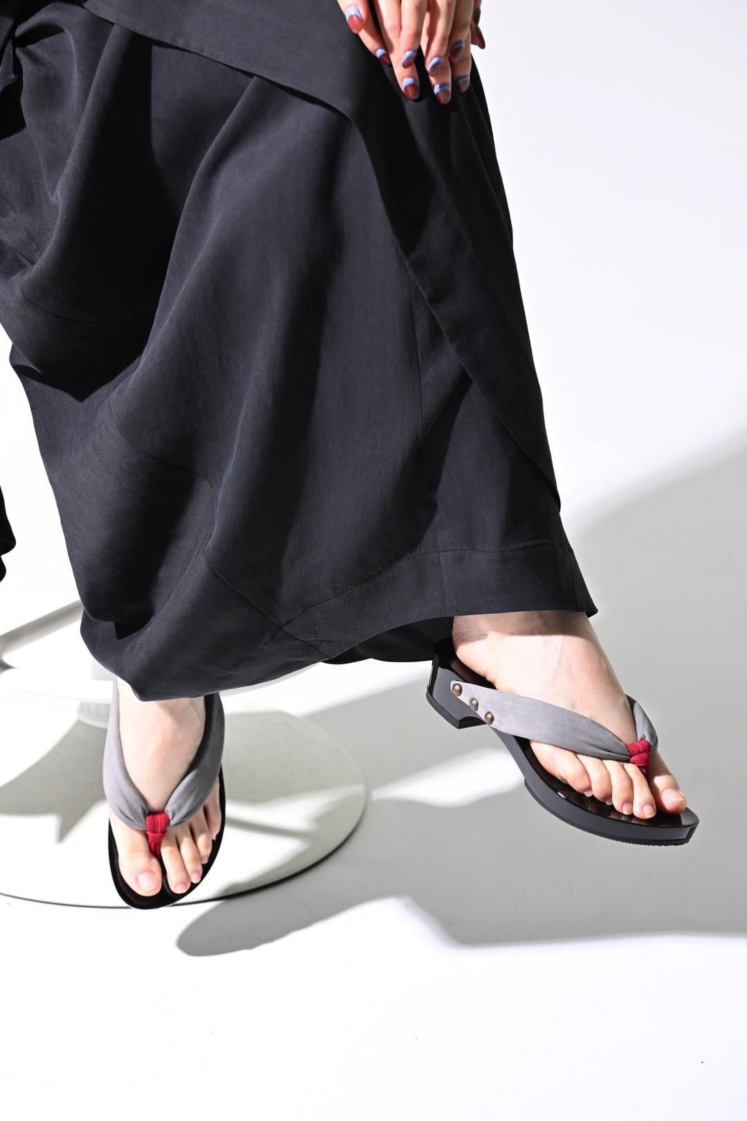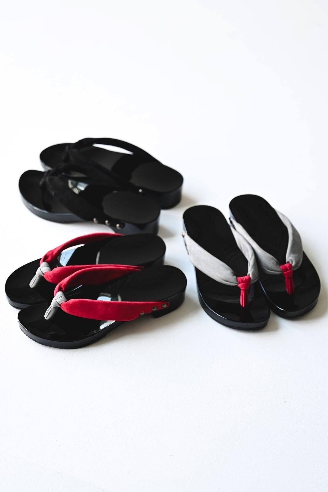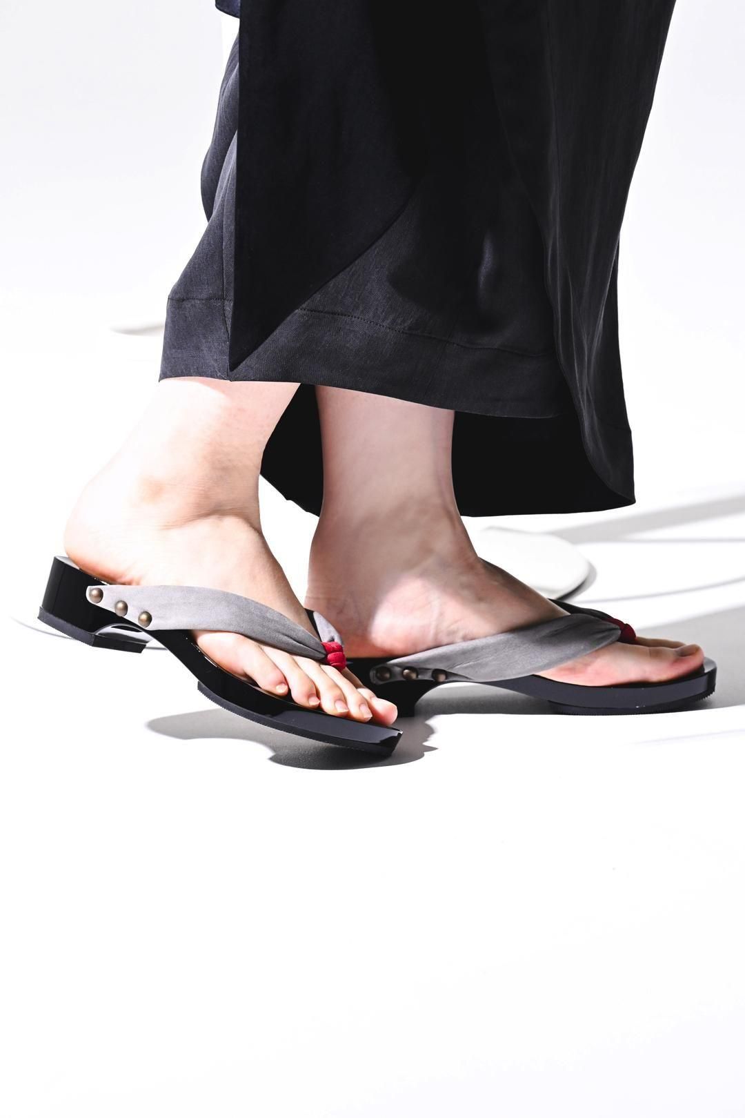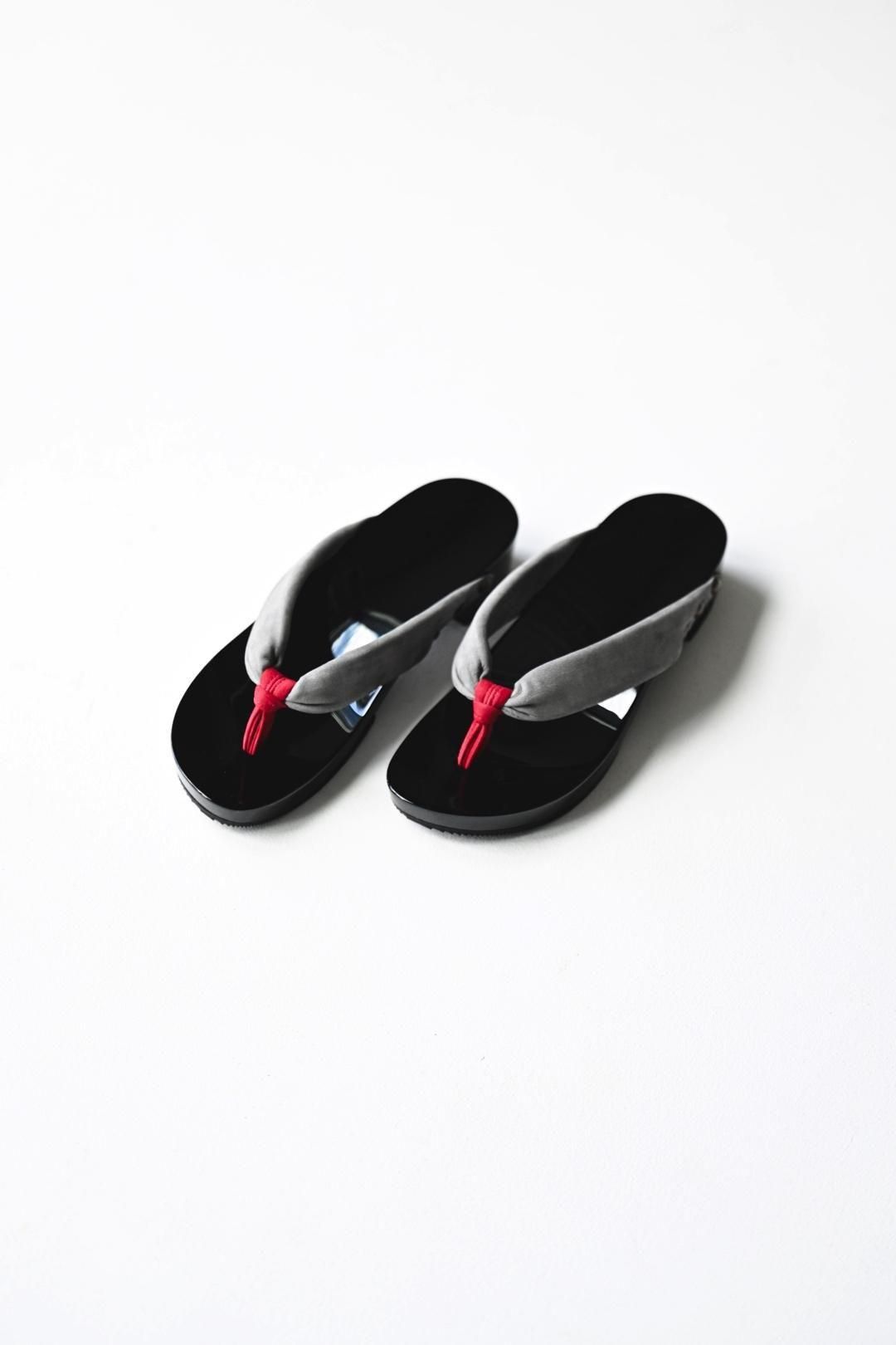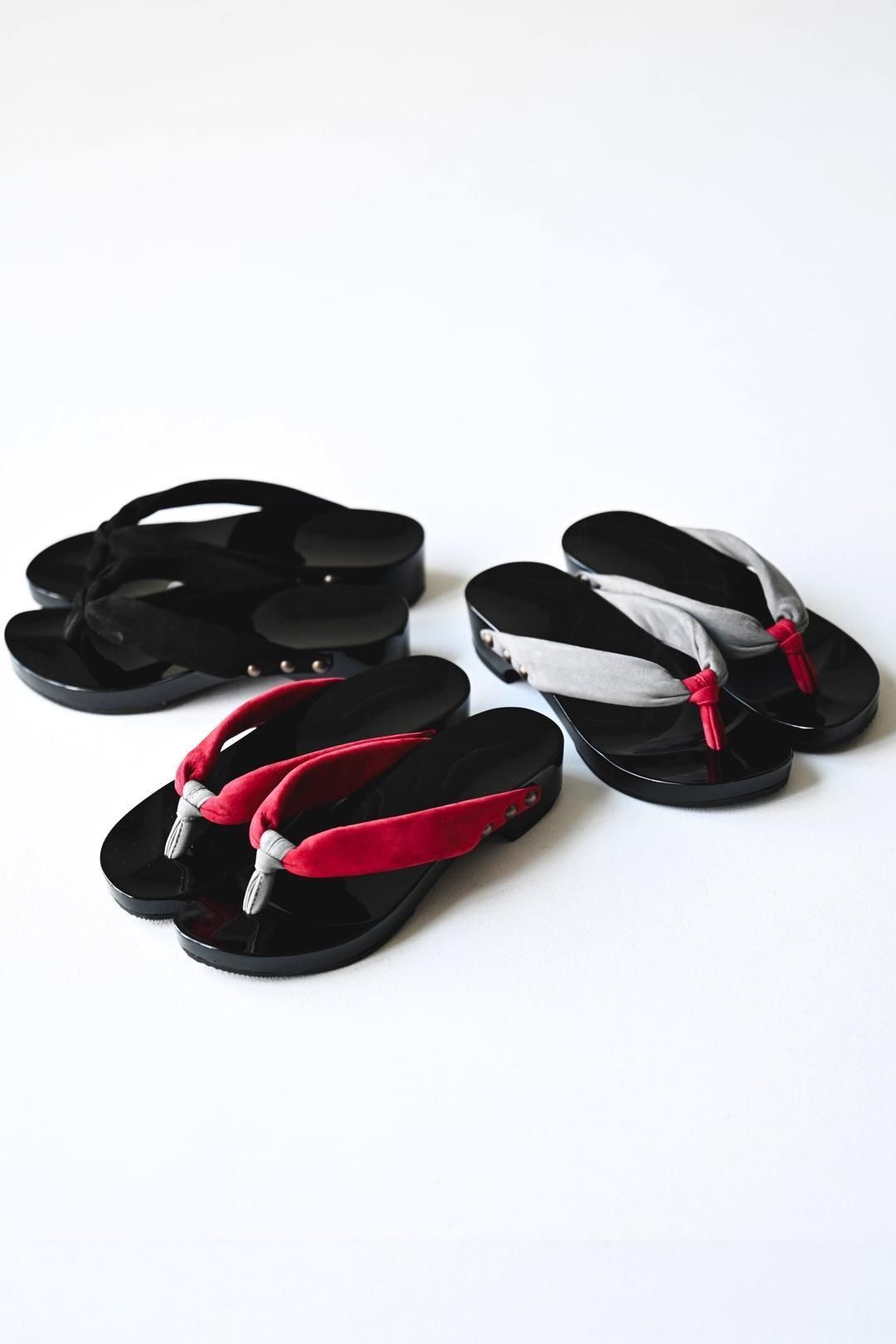 品ある黒塗りが施された木地に、上質なヌバックレザーの鼻緒を用いた美しい履き物です。
